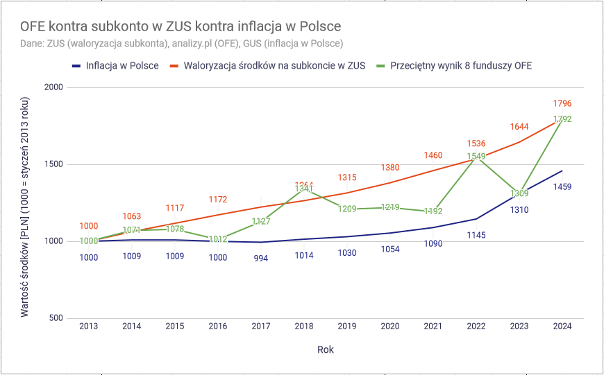 Jak można zauważyć na drugim z wykresów, OFE w latach 2014-2024 cechowała duża zmienność. W siedmiu latach trwania inwestycji były one niższe niż waloryzacja ZUS, z czego aż cztery razy różnica była znacząca: 2016, 2020, 2021 i 2023 r. OFE za to pokonywało ZUS dwukrotnie: w 2018 i 2022 r.