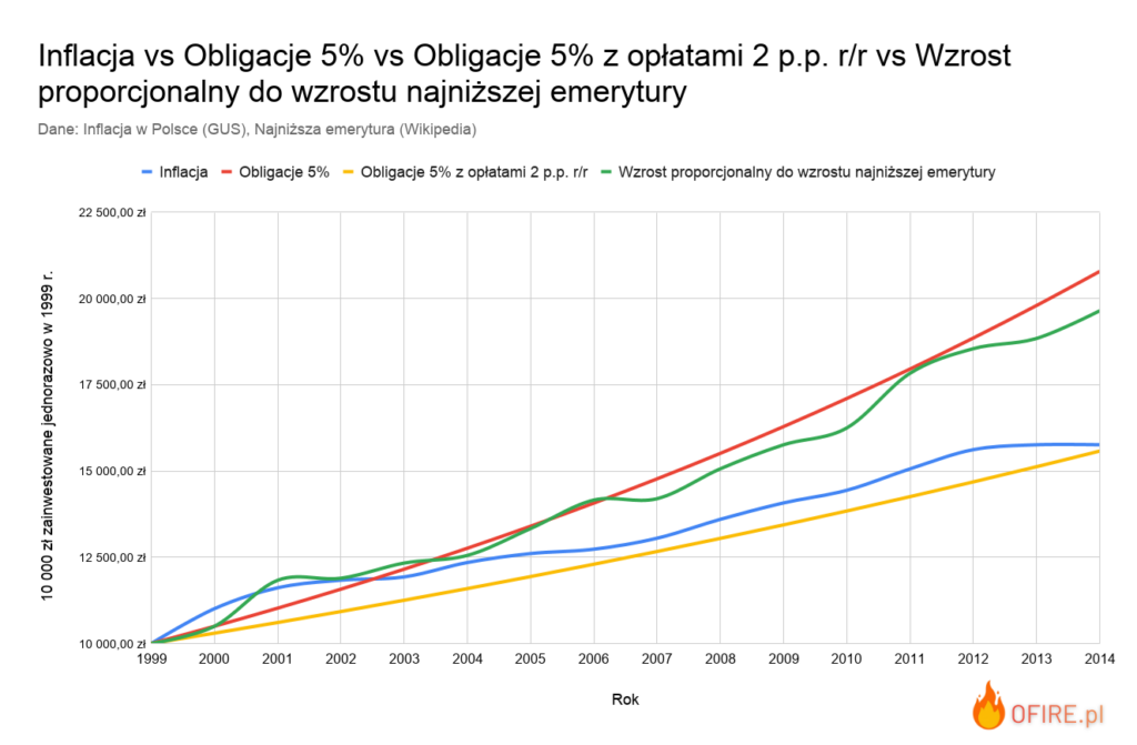 - Proporcjonalny wzrost wpłaconej kwoty do wysokości wzrostu najniżej emerytury od 2001 roku (w przypadku roku 2000 przyjąłem, że kapitał wzrósł o 5%, tak jak obligacje) zwiększył naszą inwestycję do 19 648,31 zł.