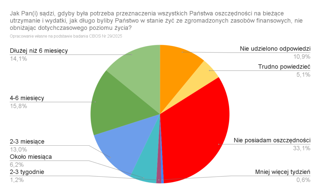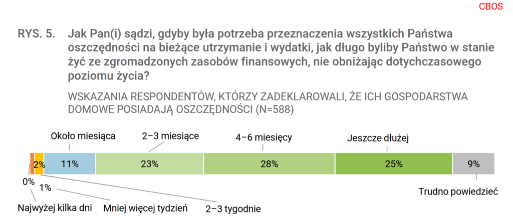 Wydaje mi się jednak, że nie podkreślenie tego, jak duży odsetek stanowią osoby bez żadnych oszczędności, jest błędem. Zauważmy, że osób, które nie posiadają żadnych oszczędności jest 33% (oddzielając ich od braku wskazań, w przeciwnym wypadku byłoby 37%), a osób, które byłyby w stanie przetrwać dłużej niż 4 miesiące ze zgromadzonego kapitału mniej, bo 30%. Traktując brak odpowiedzi i “trudno powiedzieć” jako wstydzenie się zaznaczenia odpowiedzi o braku jakichkolwiek oszczędności, zwiększyłoby nam ten odsetek do 49% – prawie połowy dorosłych Polaków! Zakres osób posiadające oszczędności ustawiłbym więc między 51% a 63%. CBOS liczby na sztywno, że to 63%.